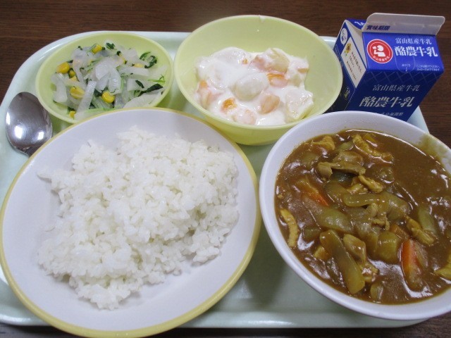 今日の献立は「チキンカレー、牛乳、水菜のサラダ、フルーツヨーグルト」でした。