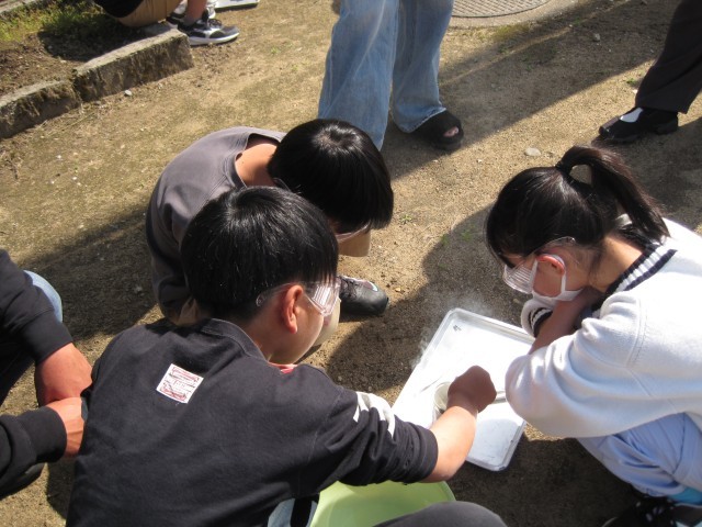 実験の仕方を確かめて、グラウンドに移動しました。うまく木を燃やすことができるのでしょうか。