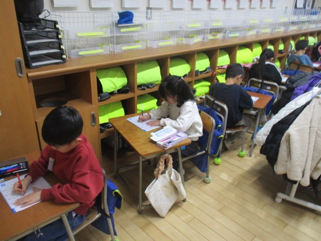 1年生は、5時間目に書き初めの練習をするみたいです。準備のできた人がどんどん増えていました。