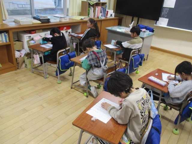 1年生の5時間目は、国語科の学習でした。「たぬきの糸車」のテストをしていました。