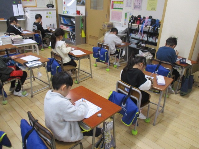 1年生は、3時間目、まだ心臓検診が続いていました。終わった人からドリルをしたり、本を読んだりしていました。
