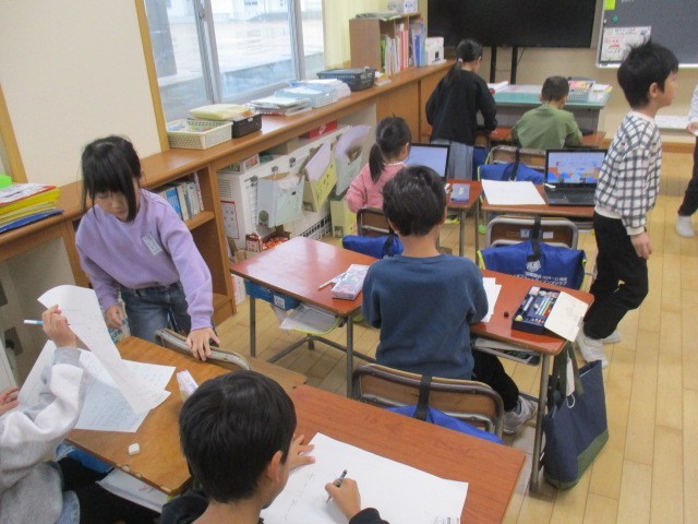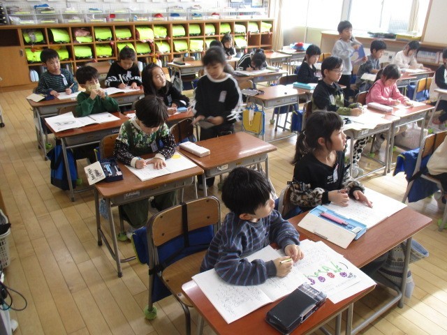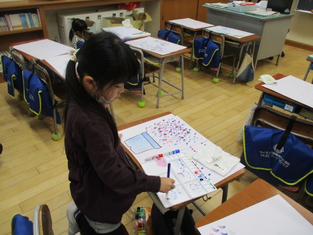 1年生の3時間目は、図工の学習でした。自由に描いた線を生かし、自分で物語をつくります。好きな食べ物や生き物等を描き、友達が描いた線とつなげます。一人一人物語は違いますが、つなげると楽しい物語になっていました。