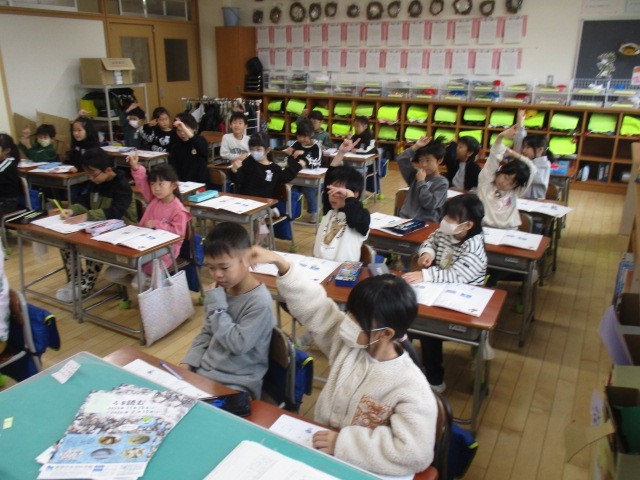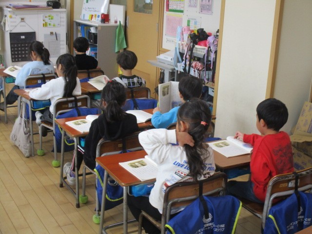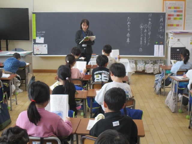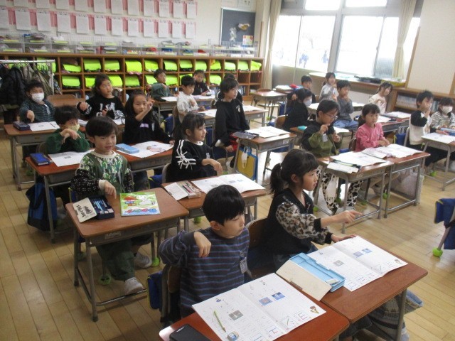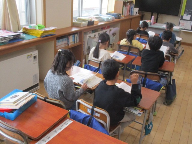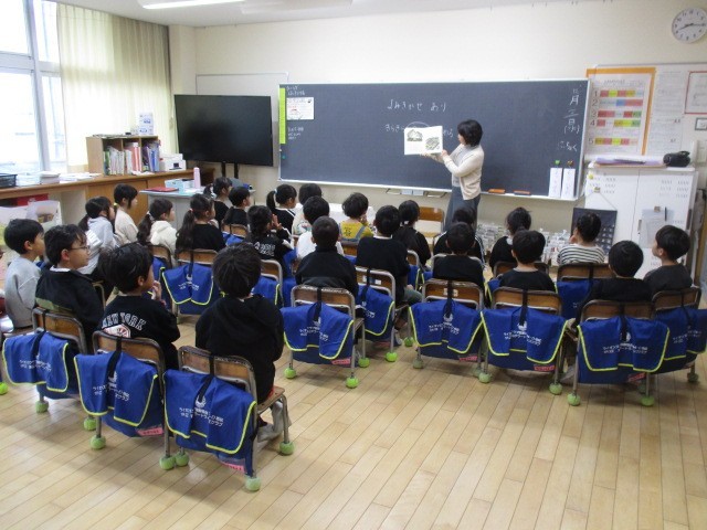 1年生の5時間目は、国語科の学習でした。「たぬきの糸車」というお話の先生の範読を聴いていました。