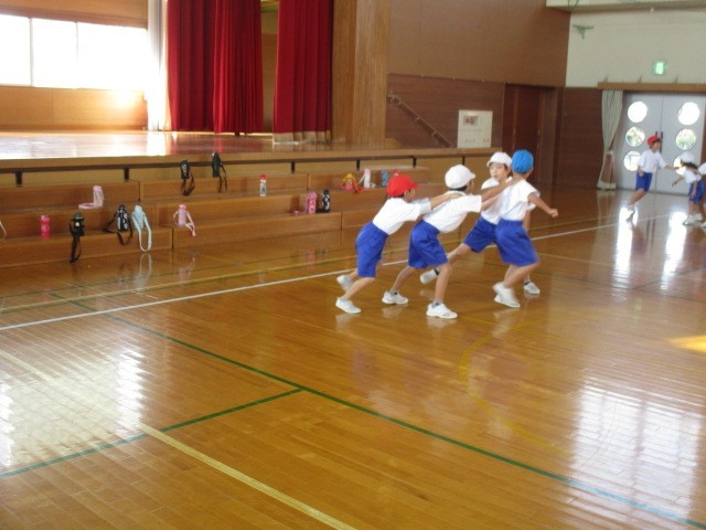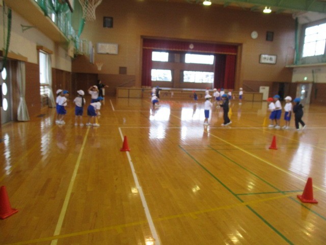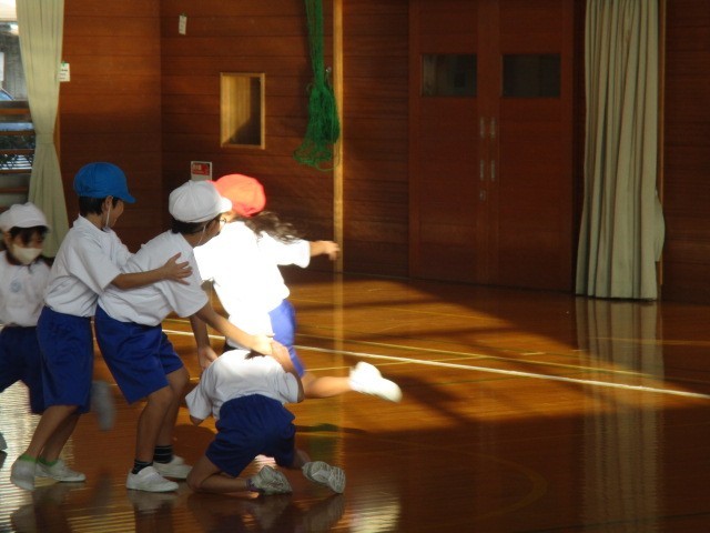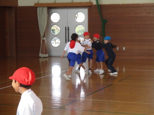 1年生の1時間目は、体育科の学習でした。チームごとに鬼がタッチしているみたいです。