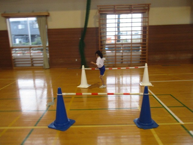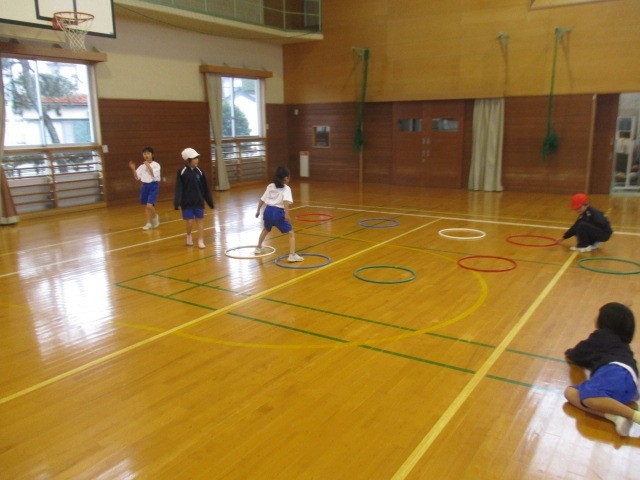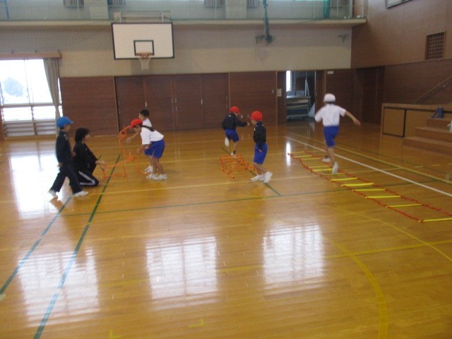 1年生の5時間目は、体育科の学習でした。ラダーやフラフープ等を使って運動していました。