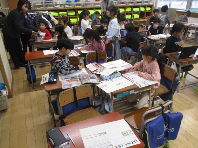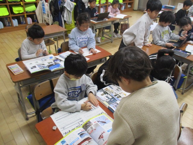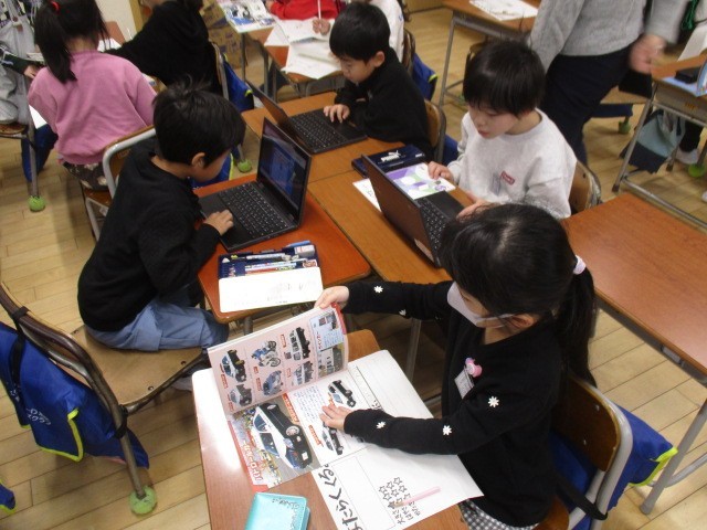1年生の1時間目は、国語科の学習でした。「はたらく車ずかん」をつくるために、はたらく車を調べていました。