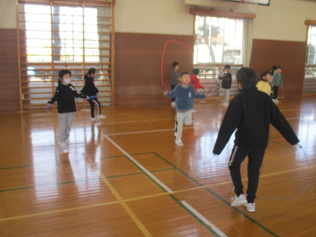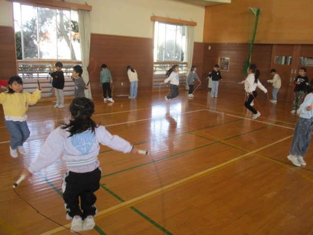 今日のぐんぐんタイムは、体育館で縄跳びでした。1年生の様子です。