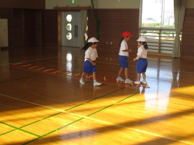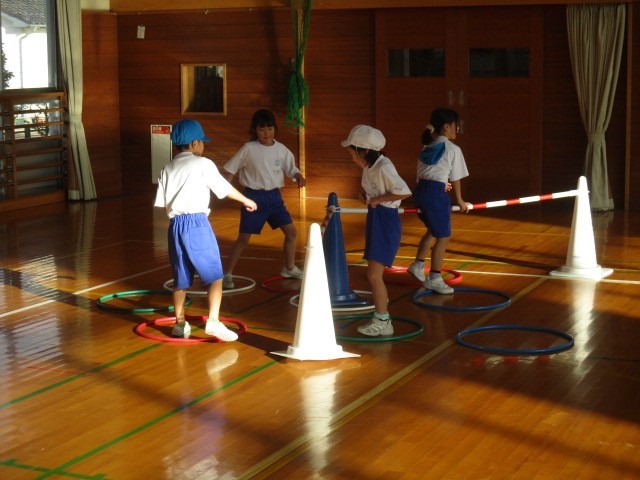 1年生の5時間目は、体育科の学習でした。ラダーやフラフープ等を使って運動していました。