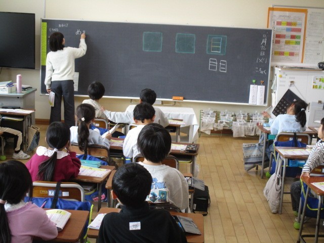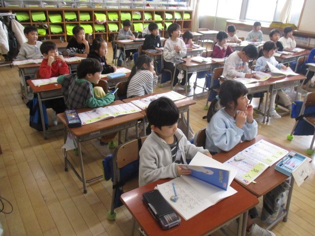 1年生の5時間目は、国語科の学習でした。「たぬきの糸車」というお話の先生の範読を聴いていました。