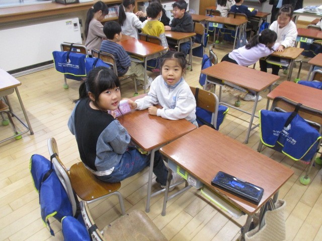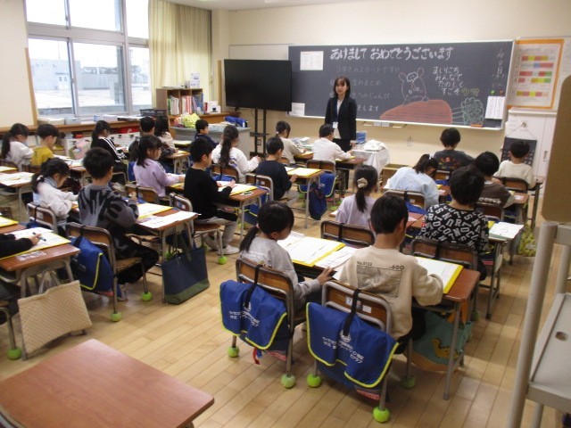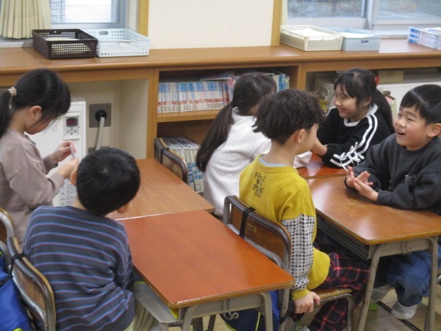 1年生は、1時間目に友達と冬休み中のことを楽しく話していました。
