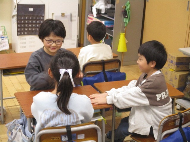 1年生は、1時間目に友達の話を一生懸命に聞いていました。1日のできごとについて話しているみたいでした。