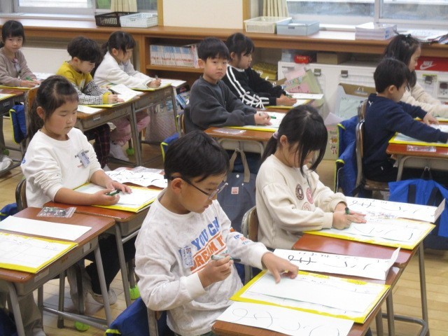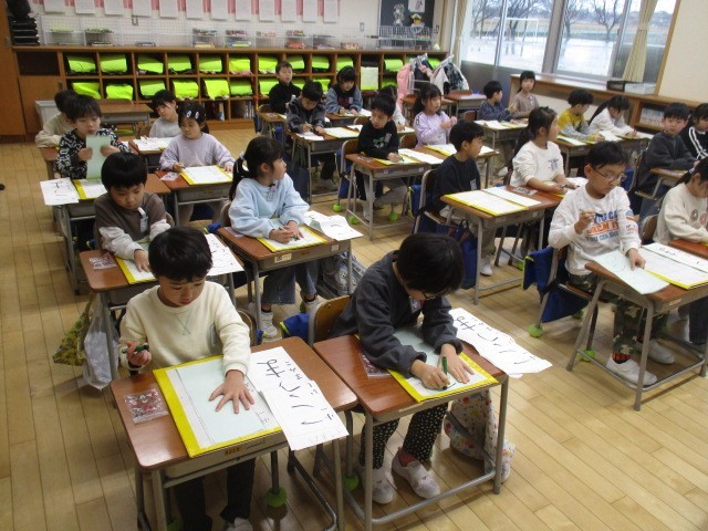 1年生の5時間目は、書写の学習でした。「こうま」という書き初めの練習をしていました。