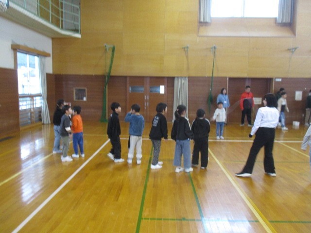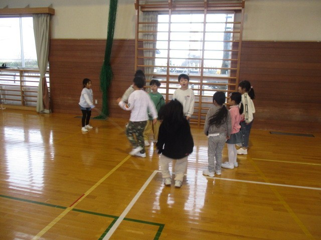 1年生の1時間目は、体育の学習でした。ペアになって背中にボールを挟んだり、フラフープを跳んだりしながら走っていました。