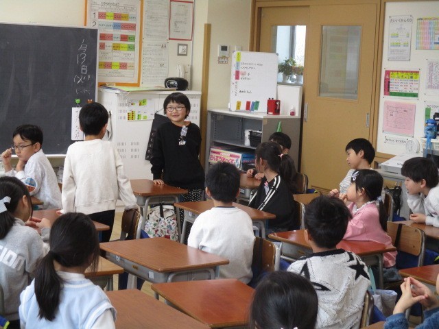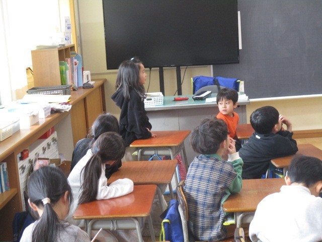 1年生の3時間目は、聞き合いの時間でした。友達の話をみんな一生懸命に聞いていました。