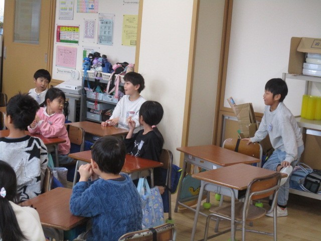 1年生は、1時間目に友達と冬休み中のことを楽しく話していました。