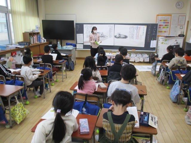 1年生の5時間目は、国語科の学習でした。「ことば へんしん」で、「いす」「いご」「さら」「たき」を「あいす」「いちご」「さくら」「たぬき」に変身させていました。