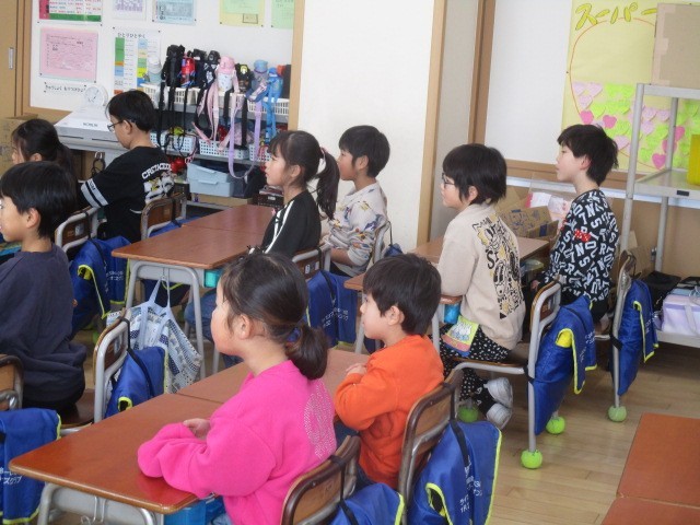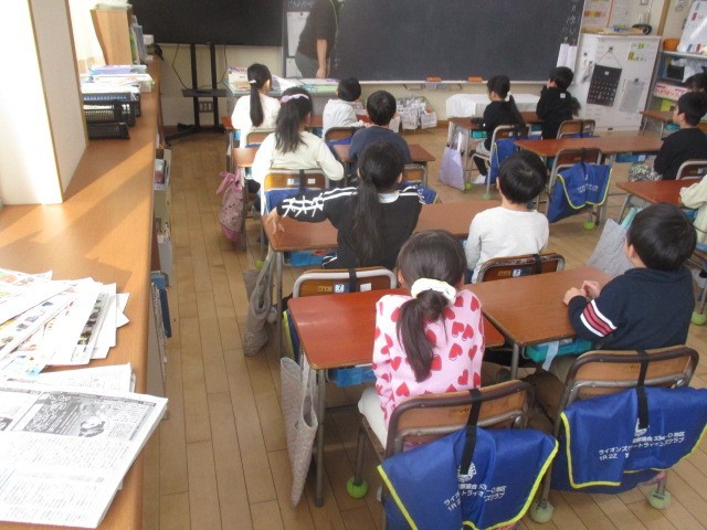 1年生は、1時間目の初めの頃、友達の話を聞いていました。雪にまつわるエピソードを聞いているようでした。