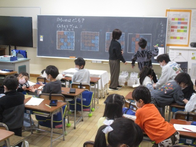 1年生の1時間目は、算数科の学習でした。陣取りゲームをして、ひろいのはどっちか考えていました。