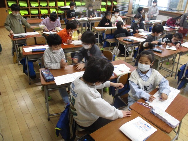 1年生は、5時間目に帰りの準備をしていました。配付物を連絡袋に入れていました。