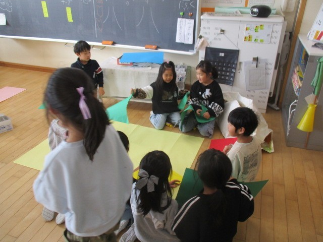 1年生の1時間目は、体育科の学習でした。グループごとに紙を選択し、書いてあるお題の動物を表現していました。