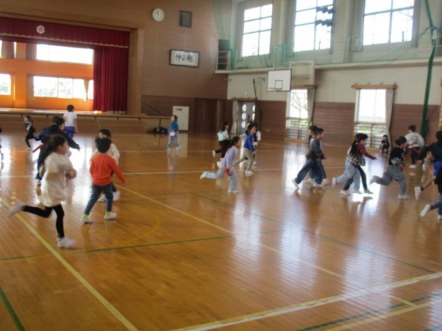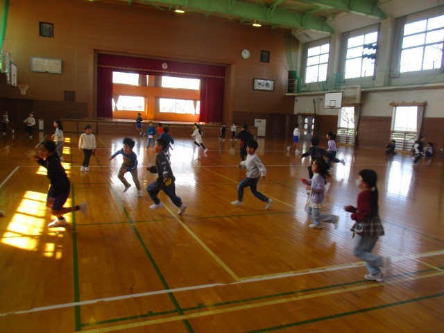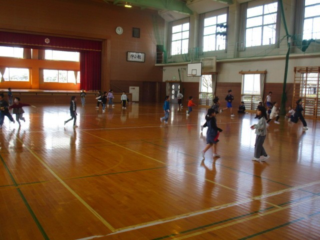 3時間目に1年生と4年生が一緒に体育館にいました。追いかけっこをしていました。