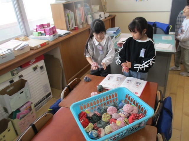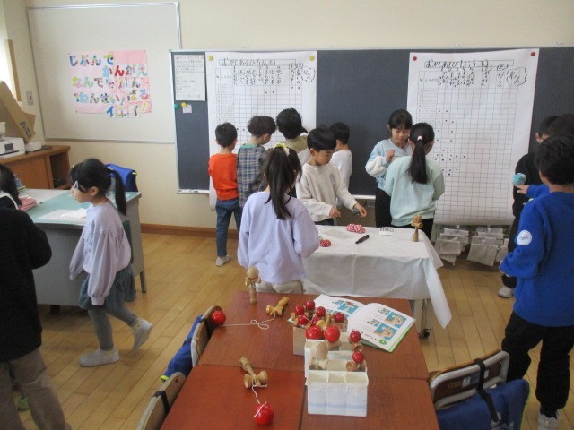 1年生の1時間目は、生活科の学習でした。むかしのあそびをしていました。だいぶん上手になってきました。