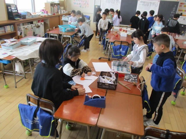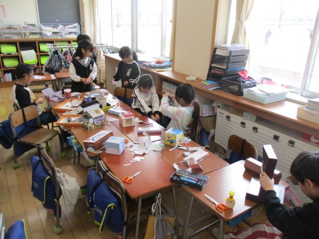 1年生の3時間目は、生活科の学習でした。画用紙でつくったり、遊んだりしていました。