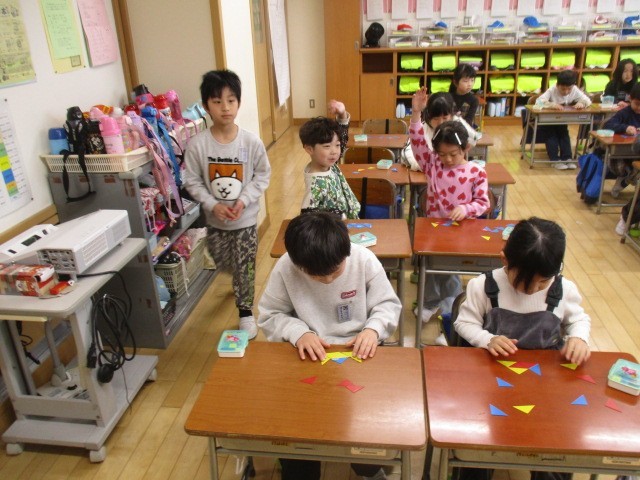 1年生の1時間目は、算数科の学習でした。三角形を組み合わせてできる形のミッションが先生から出され、みんな挑戦していました。
