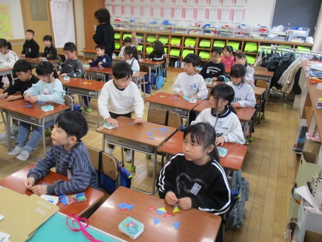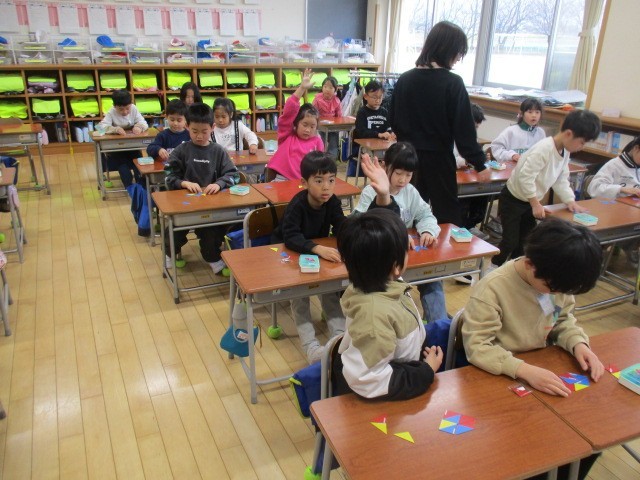1年生の3時間目は、算数科の学習でした。4枚の三角形を組み合せて課題の形をつくっていました。