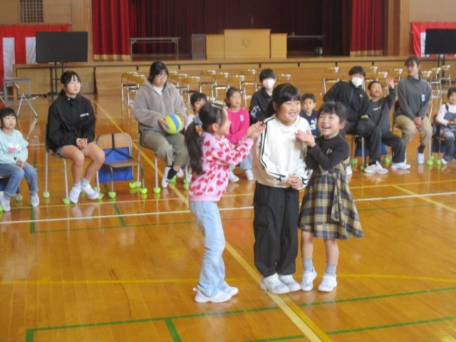 1年生は、3時間目に体育館で6年生と一緒にゲームをしていました。