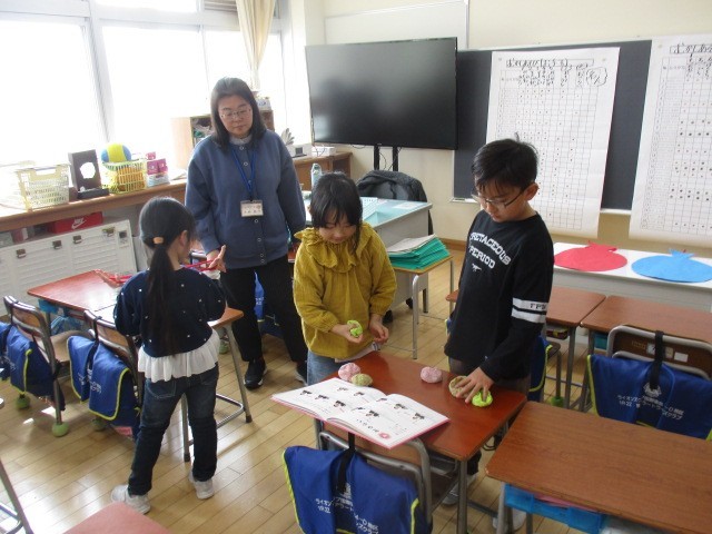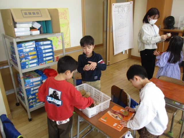 1年生の3時間目は、生活科の学習でした。画用紙でつくったり、遊んだりしていました。
