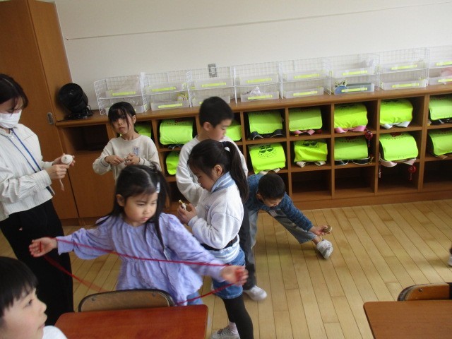1年生の1時間目は、生活科の学習でした。むかしのあそびをしていました。だいぶん上手になってきました。