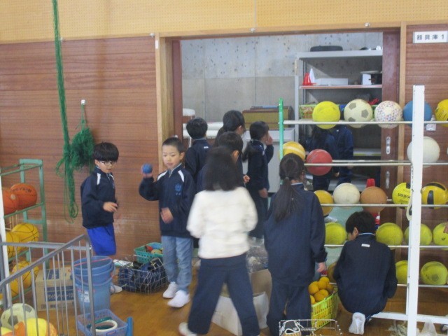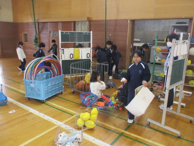 1時間目に2年生は、体育館にいました。器具庫の中の整理整頓をしていました。2年生さん、ありがとうございます。
