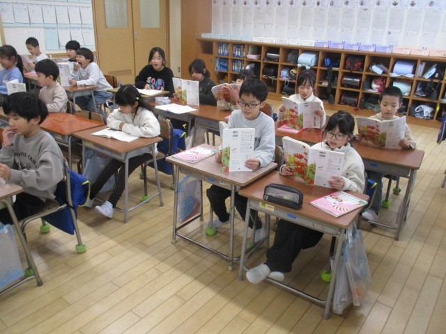 2年生は、5時間目に担任の先生の読み聞かせを聞いていました。「ともだちや」シリーズの本でした。