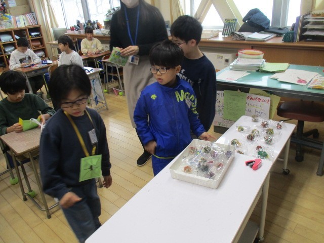 2年生は、1時間目に準備を進めていました。首飾りやプレゼントをつくっていました。