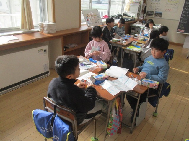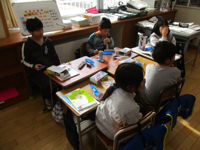 3年生の5時間目は、理科の学習でした。電球の入った箱が配られ、みんな楽しそうに名前を書いていました。