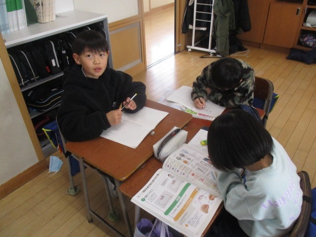 3年生は、1時間目に話合いをしていました。明日、スキー学習で4・5・6年生が学校にいないので、3年生が一番上の学年になり、どのような言動をしたらよいかについて、話し合っていました。がんばれ3年生。