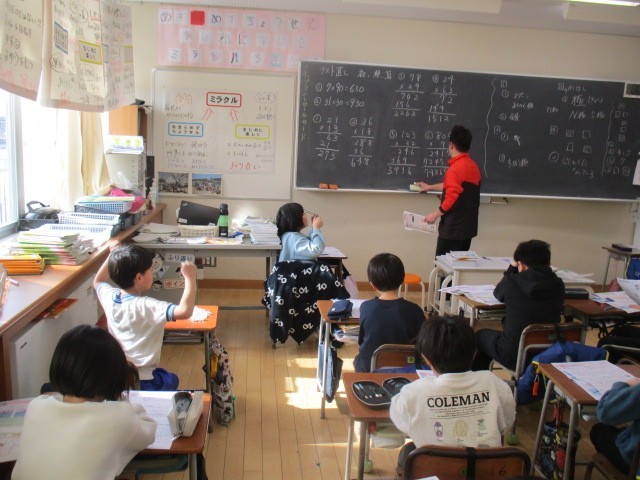 3年生の1時間目は、算数科の学習でした。かけ算のひっ算のテストをしていました。