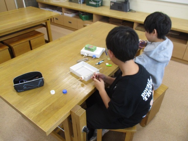 4年生の5時間目は、理科の学習でした。示温インクを入れた水で水の温まり方や、絵の具を入れた水を温めて水の動きを調べました。