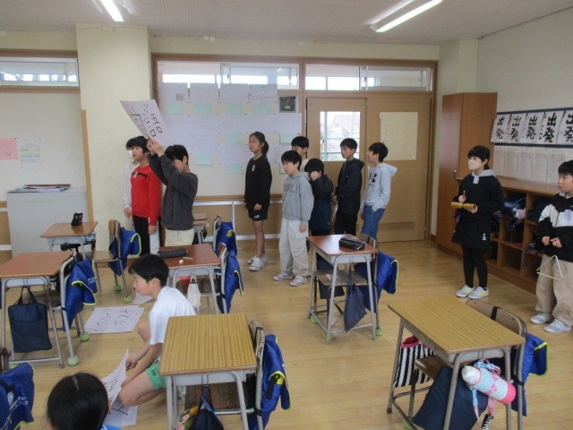 4年生は、1時間目に卒業式での在校生代表の言葉を言う人を決めていました。