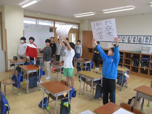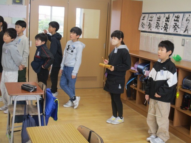 4年生は、5時間目に明日の卒業を祝う集会で6年生に見せる出しものの練習をしていました。明日、じょうずにできるといいですね。