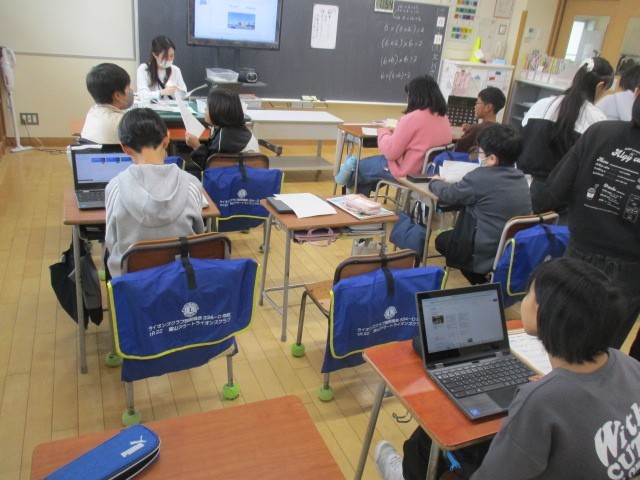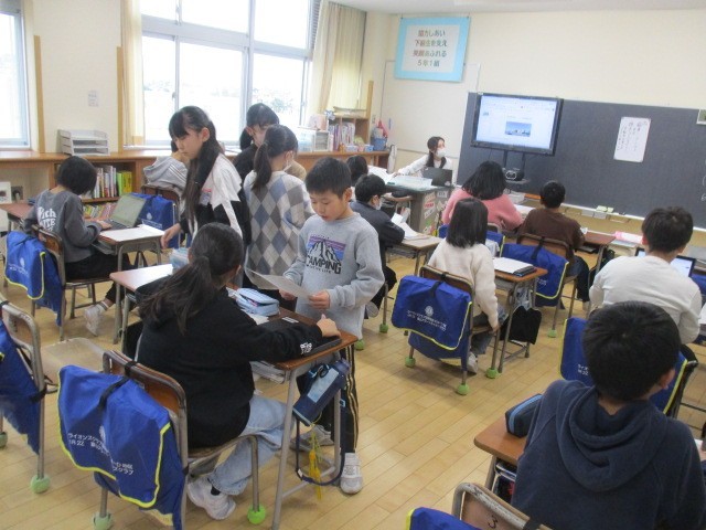 5年2組の3時間目は、外国語科の学習でした。私の町の自慢の文章を考えていました。