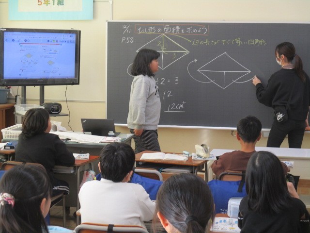 5年1組の3時間目は、算数科の学習でした。ひし形の面積について考えていました。