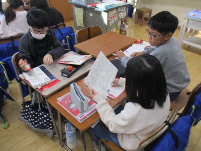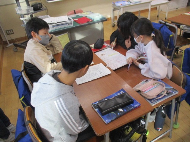 5年1組の1時間目は、国語科の学習でした。新聞記事を見ながらグループごとに話し合っていました。