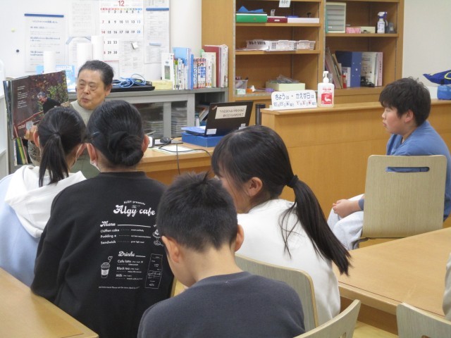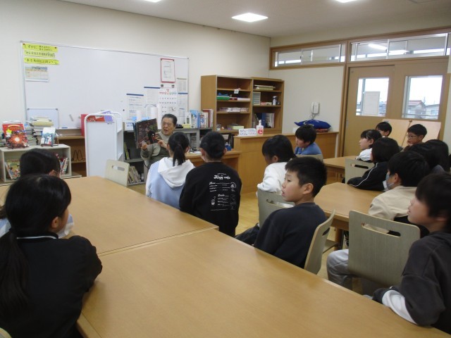 5年1組の5時間目は、図書室に行きました。学校司書の先生に、読み聞かせをしていただきました。