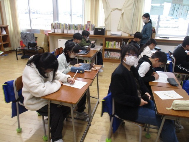 5年1組の1時間目は、国語科の学習でした。文章の構成を考えて文を書いていました。終わった人から年賀状をつくっていました。
