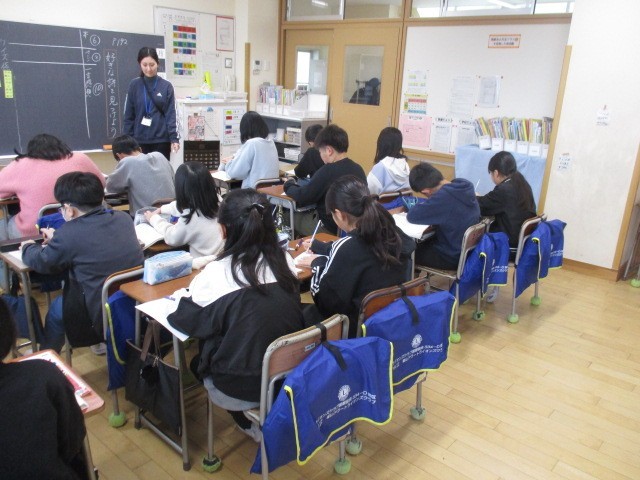 5年生の2時間目後半は、校内書き初め大会の時間でした。体育館で「平和な海」という字を丁寧に書いていました。
