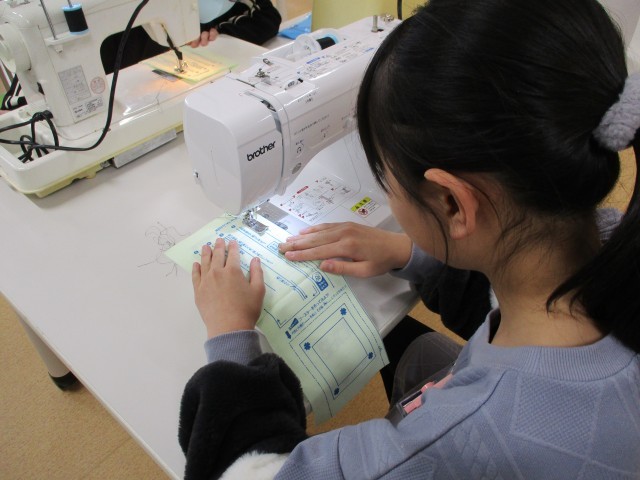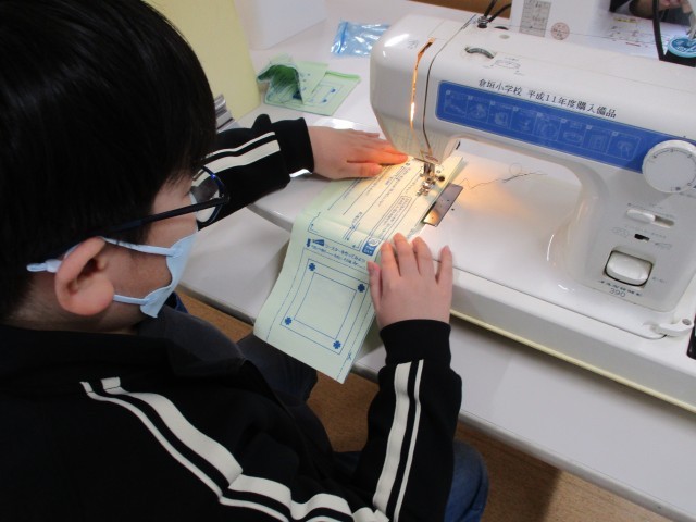 家庭科の学習で、ミシンを使い始めました。今日は初めてだったので、直線に縫う練習を行いました。