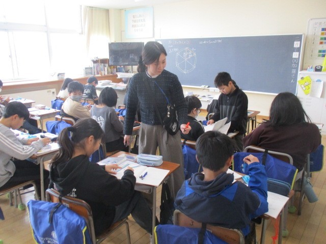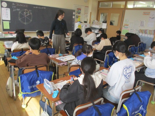 5年2組の2時間目は、算数の学習でした。正六角形を調べる方法を考えていました。