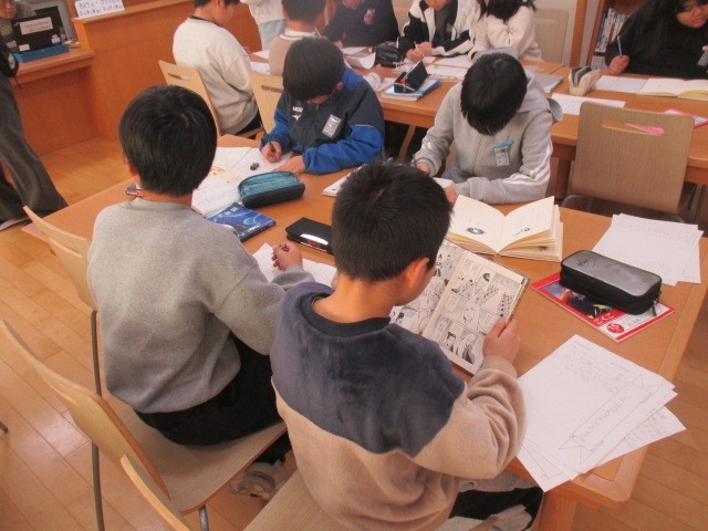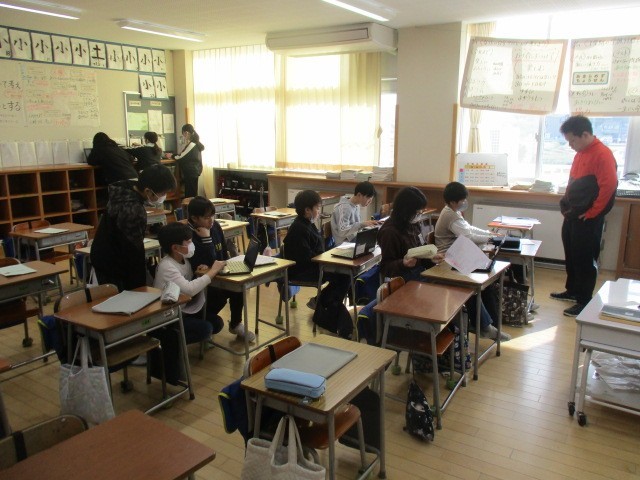 5年生は、5時間目に図工室に集まっていました。クラスごとに分かれて、掲示物について相談していました。